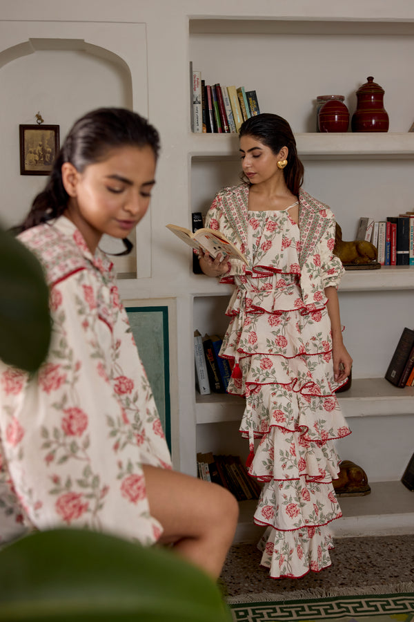 The fabric, made of natural yarns is hand blocked by artisans from Jaipur, commissioning the printing technique that involves meticulous carving of intricate designs onto wooden blocks by hand, which are then dipped into natural dyes and hand printed onto the fabric with extreme precision.