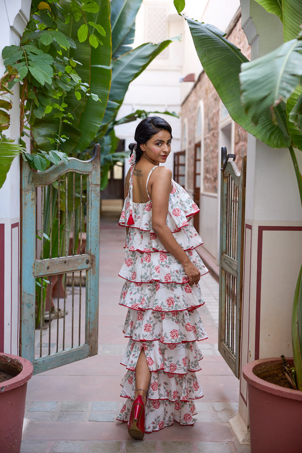 - 10.5 meters of fabric makes for this frill dress, each tier trimmed with lace