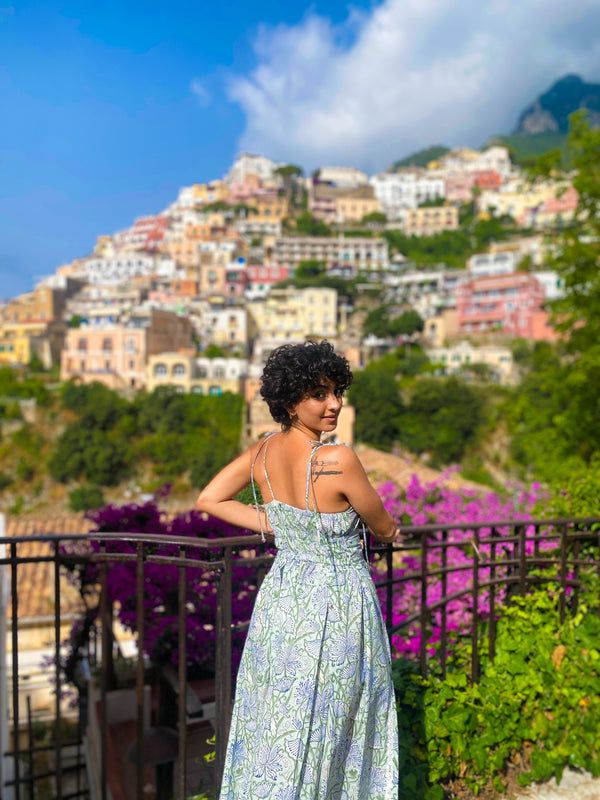 The fabric, made of natural yarns is hand blocked by artisans from Jaipur, commissioning the printing technique that involves meticulous carving of intricate designs onto wooden blocks by hand, which are then dipped into natural dyes and hand printed onto the fabric with extreme precision.