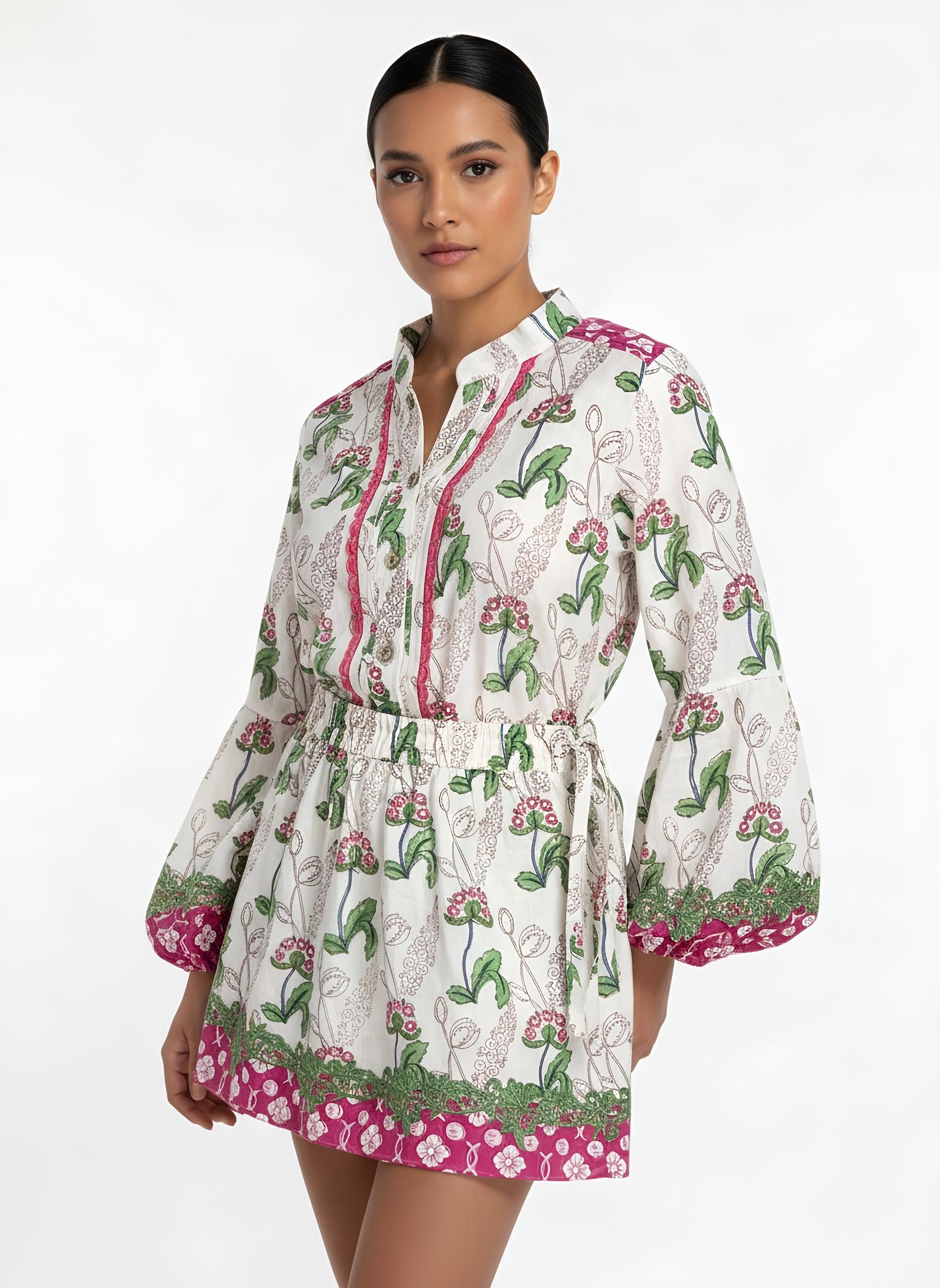 The fabric, made of natural yarns is hand blocked by artisans from Jaipur, commissioning the printing technique that involves meticulous carving of intricate designs onto wooden blocks by hand, which are then dipped into natural dyes and hand printed onto the fabric with extreme precision.