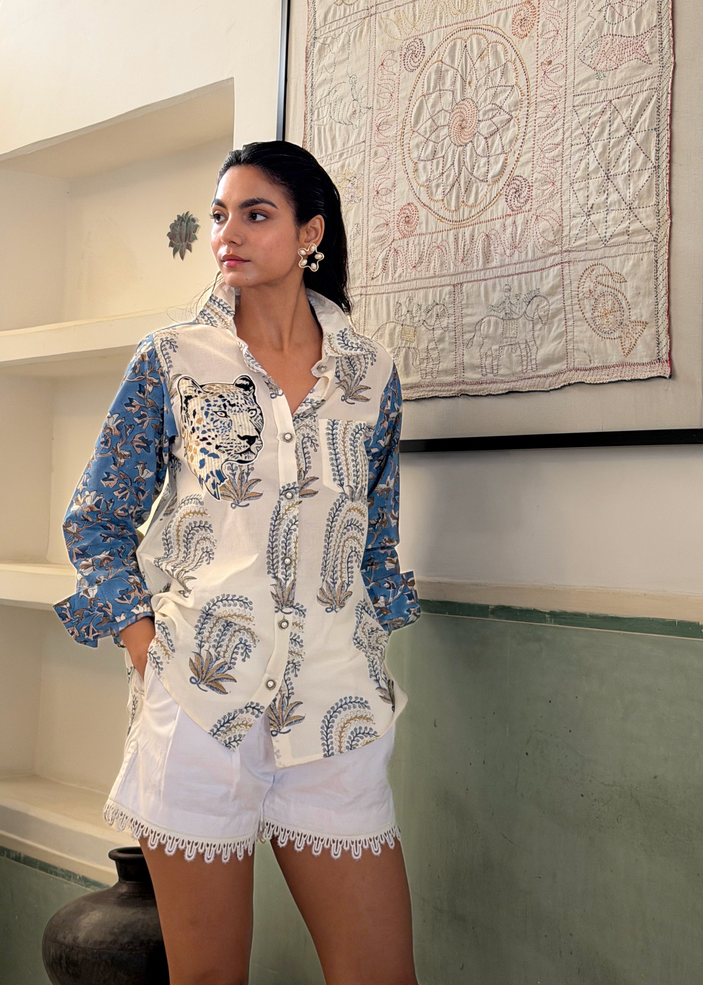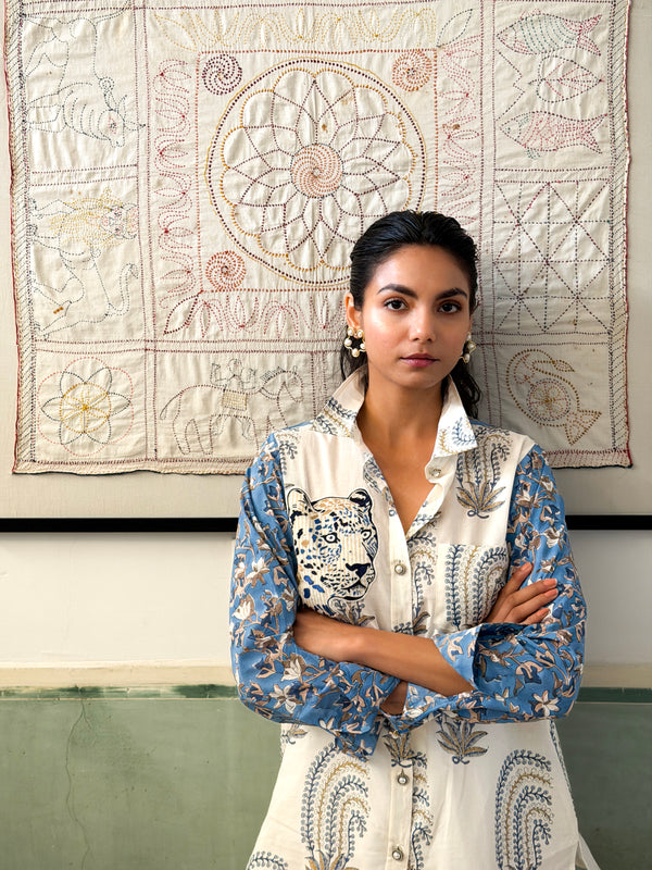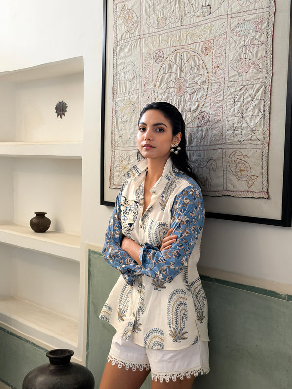 The fabric, made of natural yarns is hand blocked by artisans from Jaipur, commissioning the printing technique that involves meticulous carving of intricate designs onto wooden blocks by hand, which are then dipped into natural dyes and hand printed onto the fabric with extreme precision.