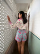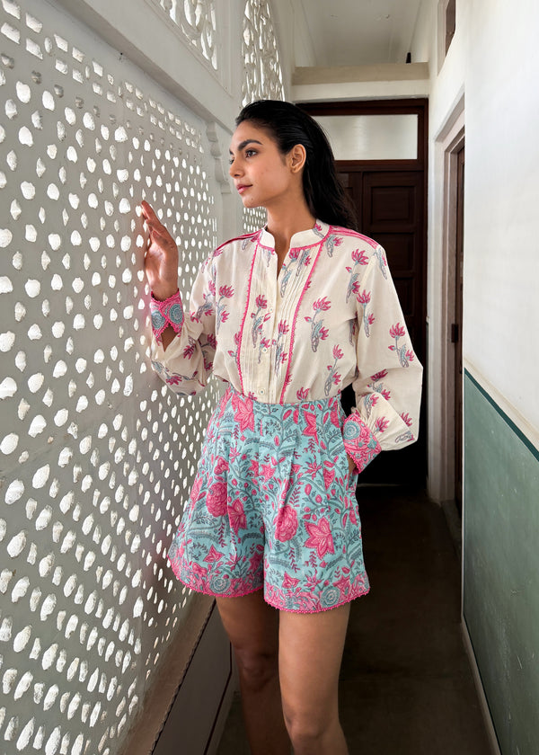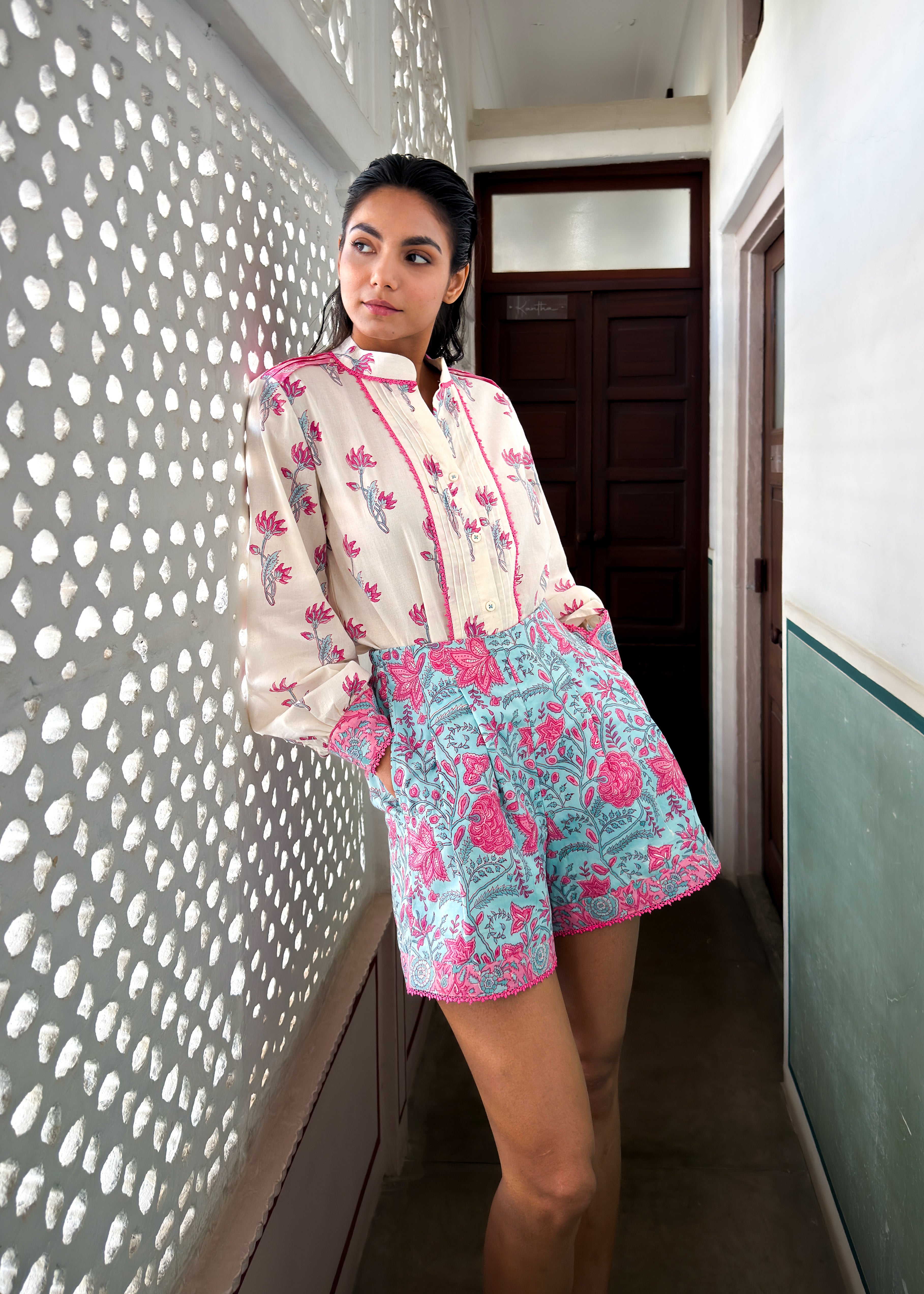 The fabric, made of natural yarns is hand blocked by artisans from Jaipur, commissioning the printing technique that involves meticulous carving of intricate designs onto wooden blocks by hand, which are then dipped into natural dyes and hand printed onto the fabric with extreme precision.