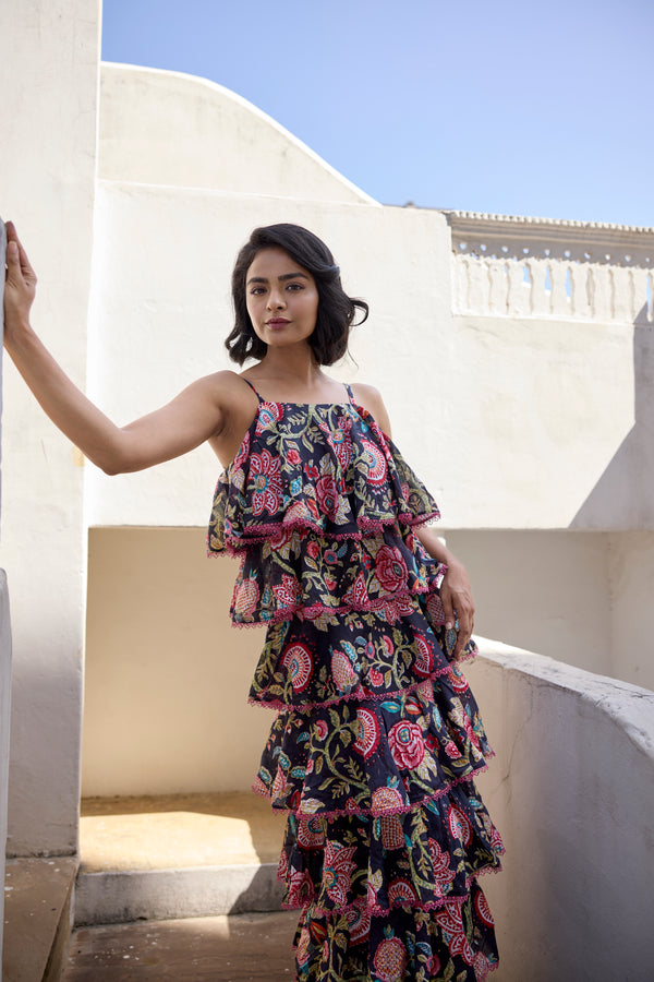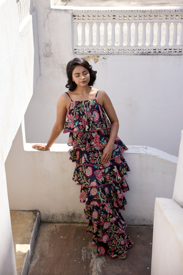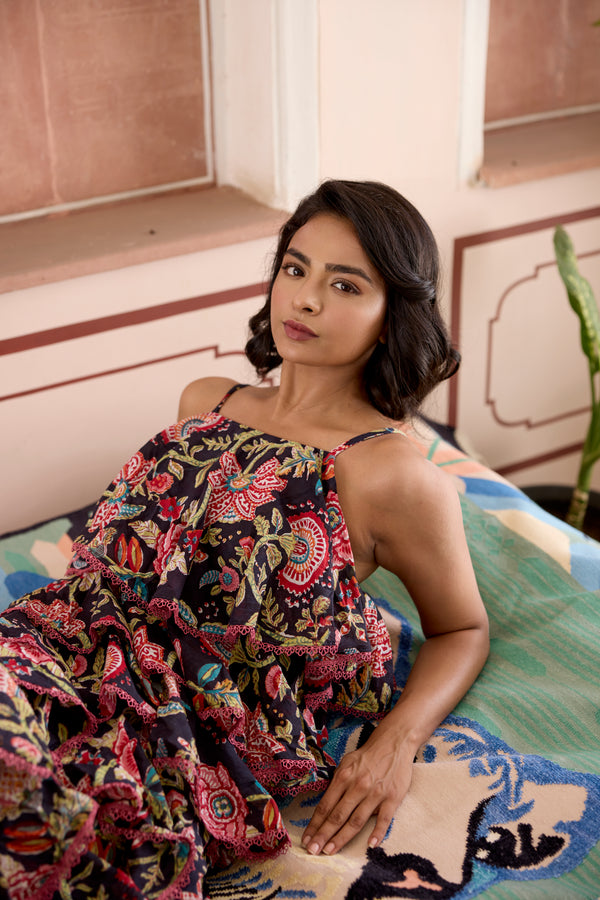 The fabric, made of natural yarns is hand blocked by artisans from Jaipur, commissioning the printing technique that involves meticulous carving of intricate designs onto wooden blocks by hand, which are then dipped into natural dyes and hand printed onto the fabric with extreme precision.