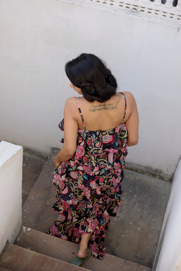 - 10.5 meters of fabric makes for this frill dress, each tier trimmed with lace