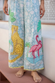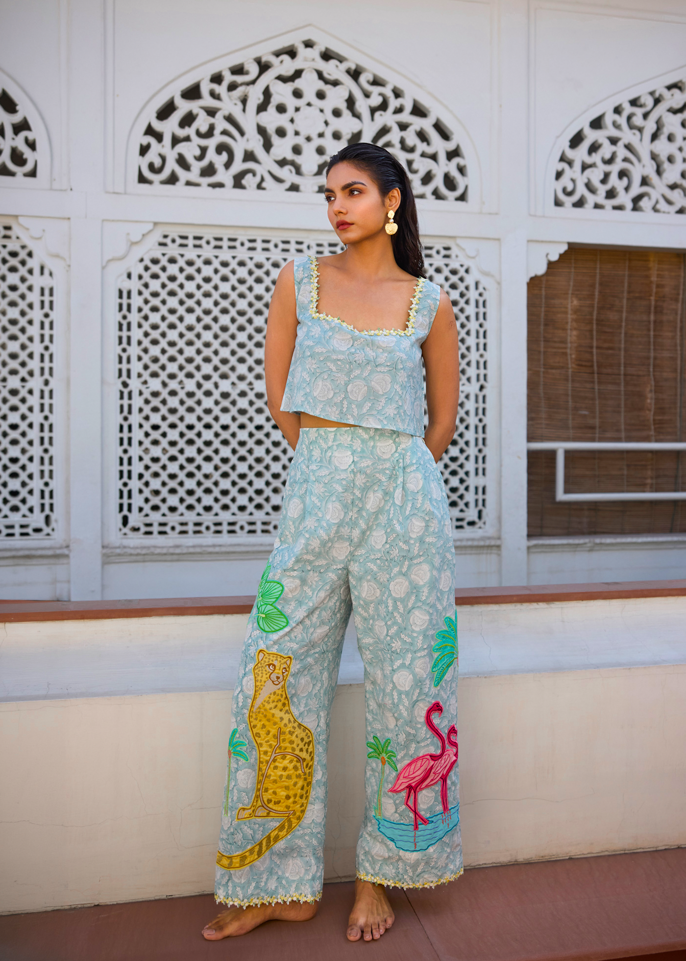 The fabric, made of natural yarns is hand blocked by artisans from Jaipur, commissioning the printing technique that involves meticulous carving of intricate designs onto wooden blocks by hand, which are then dipped into natural dyes and hand printed onto the fabric with extreme precision.